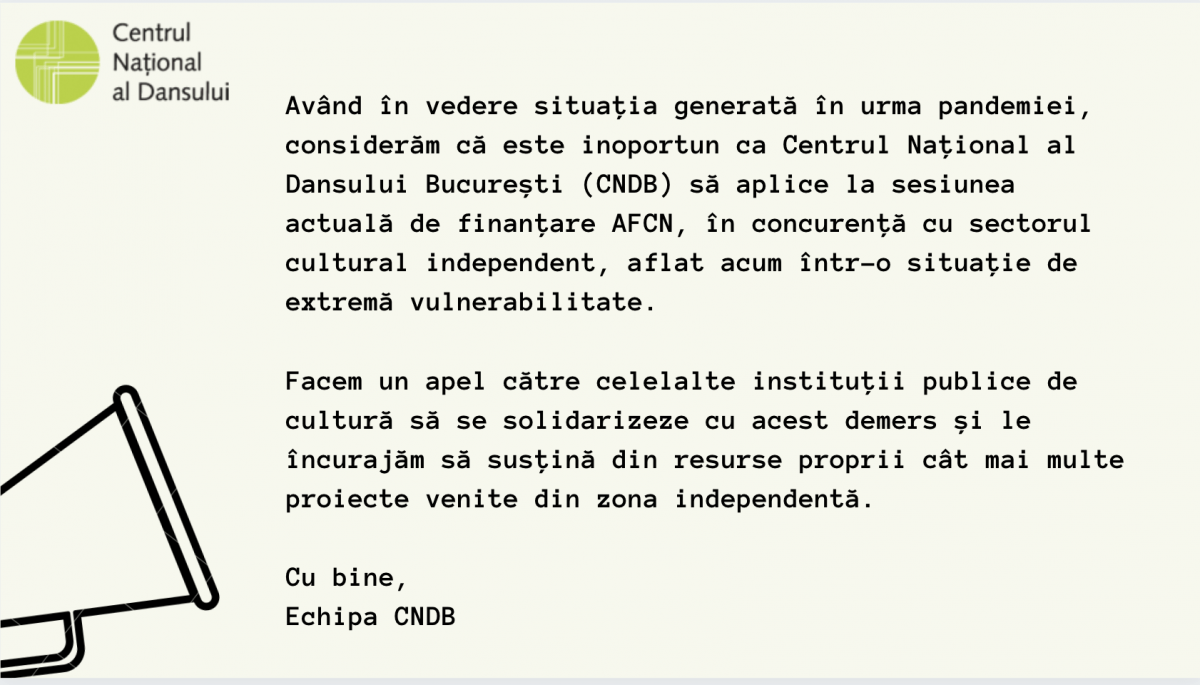 25.3.2020 – The Administration of the National Cultural Fund announces that it keeps open the call for the second financing session of 2020, precisely to support the cultural operators in the context of the aggravation of the crisis caused by Covid-19. Moreover, some of the public cultural institutions (National Dance Centre, National Heritage Institute, Clujean Cultural Centre, National Museum Complex ASTRA Sibiu, Studio M Theatre in Sfantu Gheorghe) announce that they will not attend this funding session in order to show its solidarity with the independent cultural operators, whose resources have been drastically diminished.