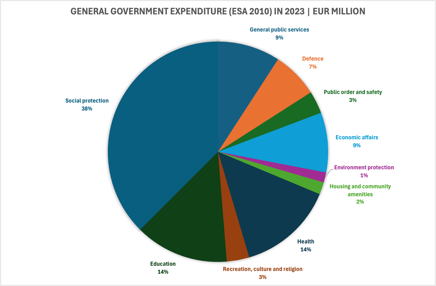 In 2024, Lithuania's GDP at current prices was 77.94 billion EUR, and GDP per capita at current prices was 27 150 EUR (data from World Bank Group). In 2023, Lithuania's GDP at current prices was 73.8 billion EUR, and GDP per capita at current prices was 25 700 EUR. Total general government expenditure was 30.99 billion EUR in 2024, and 27.58 billion EUR in 2023. Public expenditure on recreation, culture and religion* at all levels of government in 2023 was 912.8 million EUR. The central government’s share of expenditure was 465.1 million EUR, and the share of local governments was 447.7 million EUR. Public expenditure on recreation, culture and religion as a percentage of the total public expenditure was 3.3 %, and as a percentage of GDP was 1.2 %. Public expenditure on recreation, culture and religion per capita was 326 EUR.